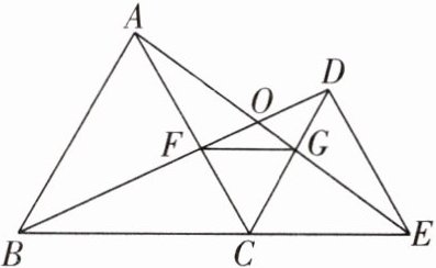 题型1 如图,已知 $\triangle ABC$ 和 $\triangle DCE$ 均是等边三角形,点 $B$,$C$,$E$ 在同一条直线上,$AE$ 与 $BD$ 交于点 $O$,$AE$ 与 $CD$ 交于点 $G$,$AC$ 与 $BD$ 交于点 $F$,连接 $FG$,则下列结论:① $AE = BD$,② $AG = BF$,③ $FG // BE$,④ $\triangle CFG$ 是等边三角形。其中正确结论的个数为(