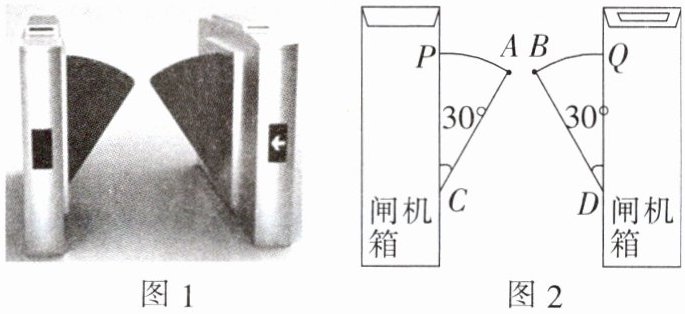 11. 如图1,这是某超市入口的双翼闸门,图2是它的示意图,当它的双翼展开时,双翼边缘的端点A与B之间的距离为10 cm,双翼的边缘AC= BD= 54 cm,且与闸机侧立面的夹角∠PCA= ∠BDQ= 30°,求当双翼收起时,可以通过闸机的物体的最大宽度。