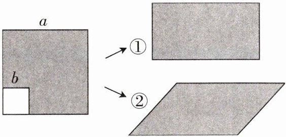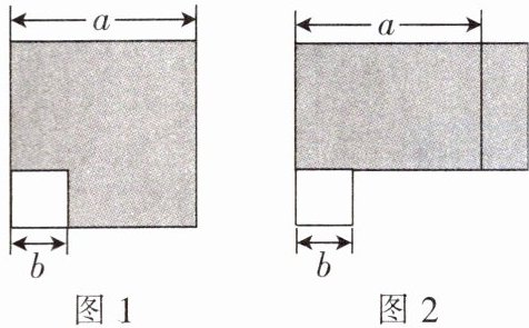 10. 如图1,边长为$a的大正方形中有一个边长为b$的小正方形,把图1中的阴影部分裁剪拼成一个长方形(图2所示)。