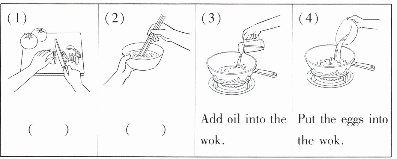 Task1:看图,学习番茄炒蛋的做法,并将方框中相应句子的字母编号写在括号内。