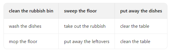 sweep the floor、put away the dishes、clean the table、wash the dishes、take out the rubbish、clear the table、mop the floor、put away the leftovers。