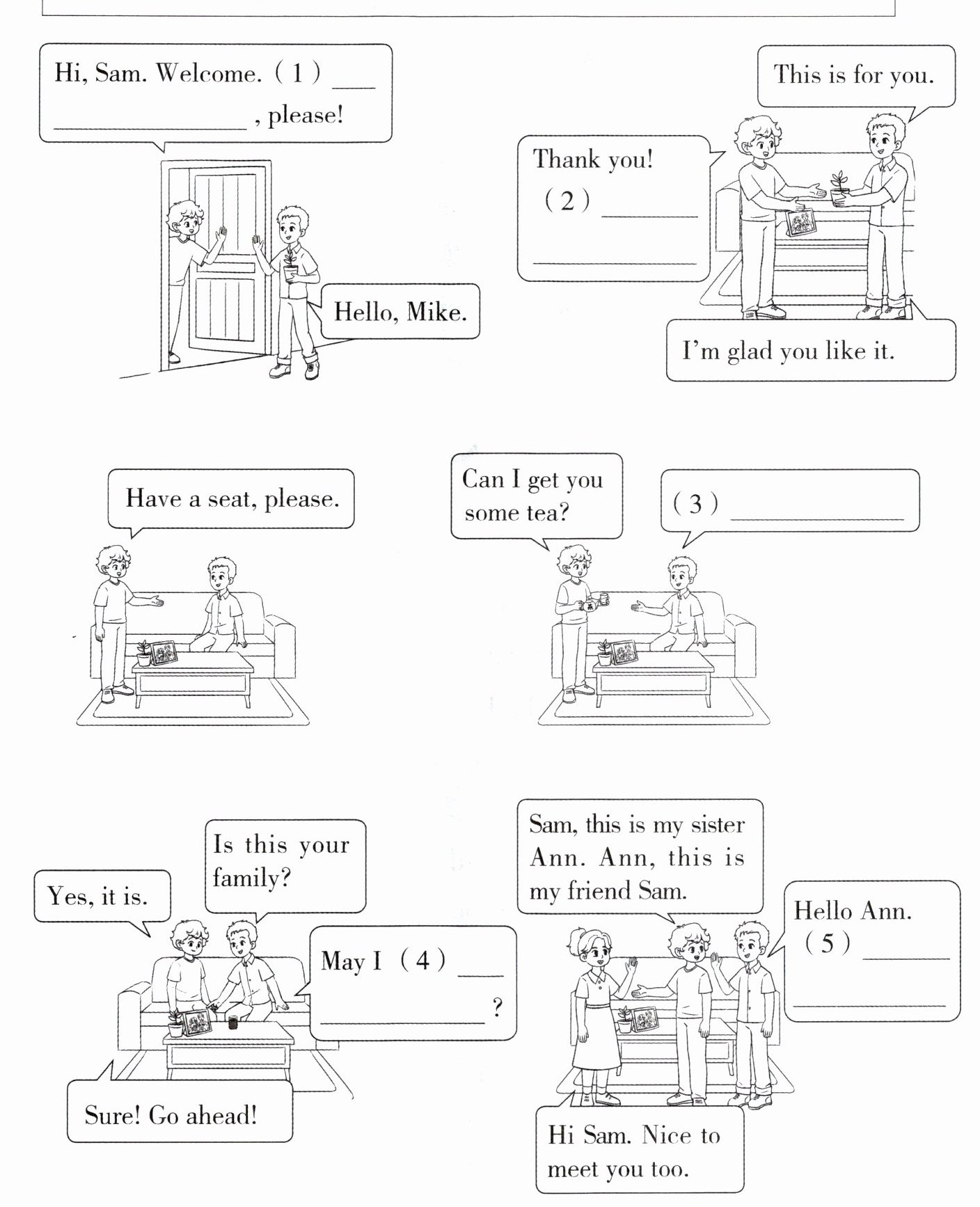 6. 将方框中所给的表达抄写到图中横线上,使对话完整。