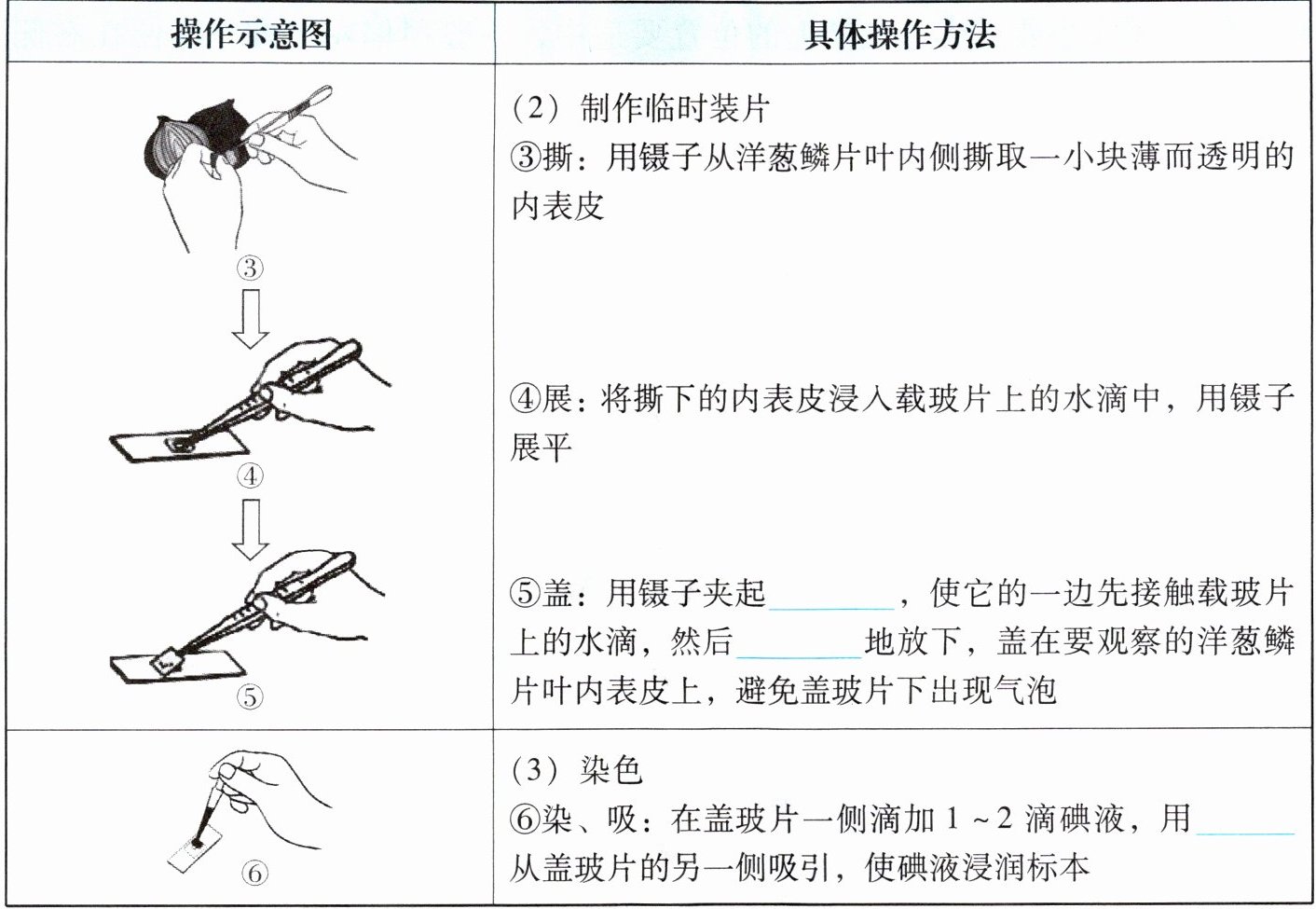 (三)1.(1)①纱布 ②清水 (2)⑤盖玻片 缓缓 (3)⑥吸水纸 3.细胞壁 细胞核 4.(图略) (1)字 图名 (3)多 (4)右 (四)液泡 细胞质 叶绿体 细胞膜 (五)1.观察材料一定要薄而透明。 2.制作彩椒外表皮细胞临时装片、黑藻叶片细胞临时装片时,不需要“撕”。因为彩椒的外表皮厚,不容易撕取,可取一小块果皮且将其上的果肉用刀片刮去。而黑藻的叶片比较薄,可用镊子直接取一片幼嫩小叶制成临时装片。