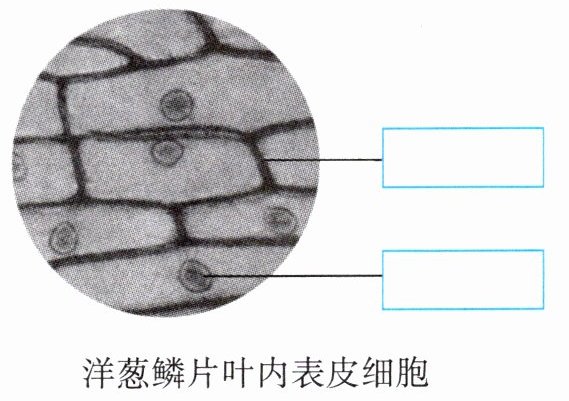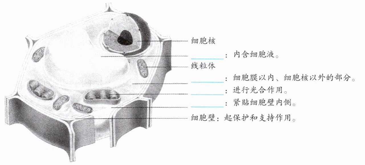 在低倍镜 (目镜和低倍物镜的组合) 下仔细观察制成的植物细胞临时装片,可对照课本的植物细胞模式图,辨认植物细胞的不同形态和结构,并写出右图中指示的结构名称。
