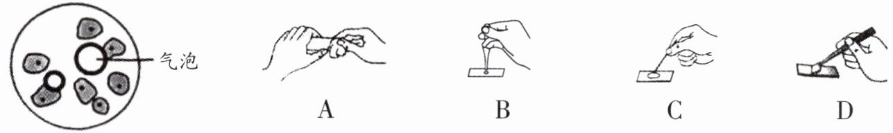 6. 某同学在制作并观察人的口腔上皮细胞临时装片时,显微镜视野中出现了下图所示的气泡。与此有关的实验操作可能是(