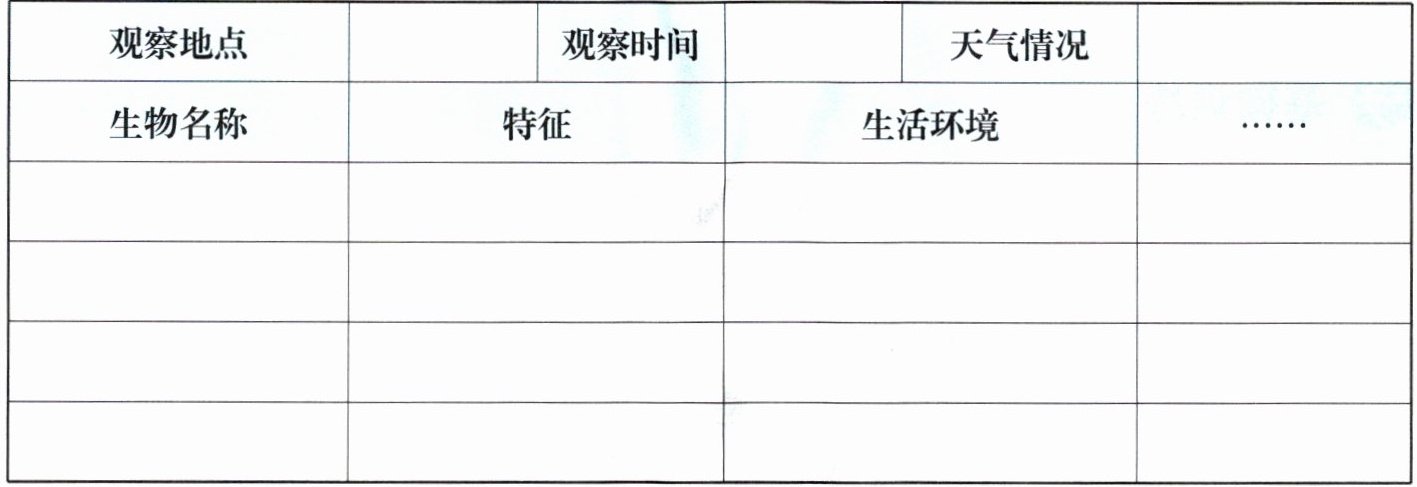 (具体表格及讨论内容如上所示,根据实际观察可调整生物名称及细节,核心符合生物基本特征及观察逻辑即可。)