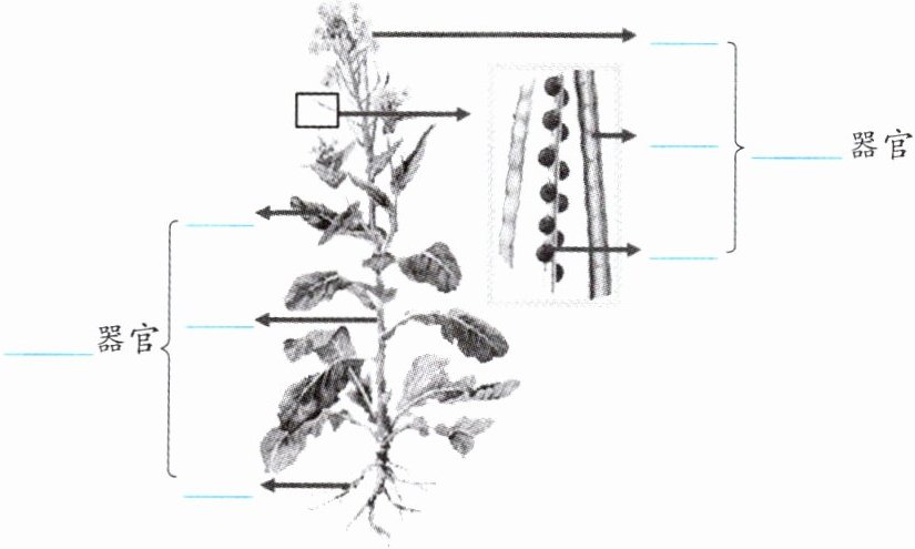 油菜植株及其六大器官如下图所示,请在图旁填出对应名称。