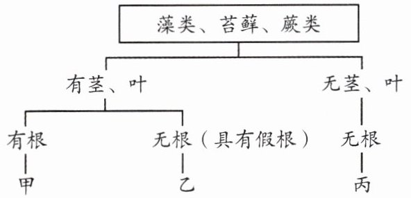6. 某同学构建了一个关于藻类、苔藓、蕨类特点的分类关系图 (如下图)。甲、乙、丙依次代表(