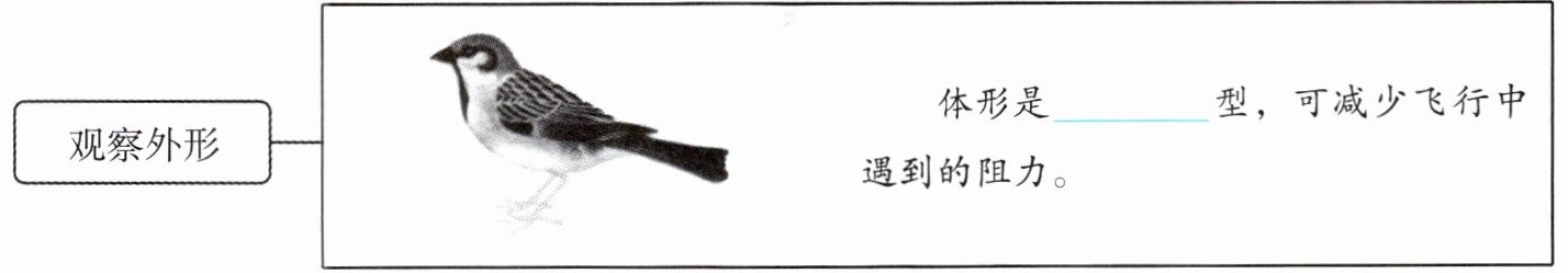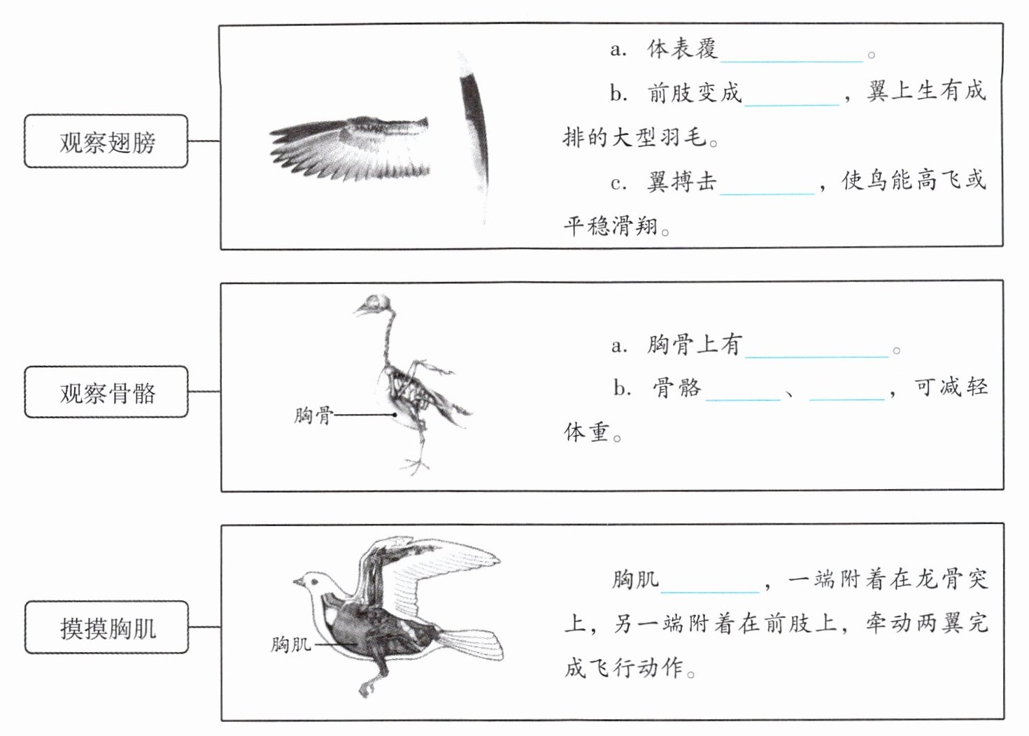 (3)观察外形:流线 观察翅膀:a.羽 b.翼 c.空气 观察骨骼:a.龙骨突