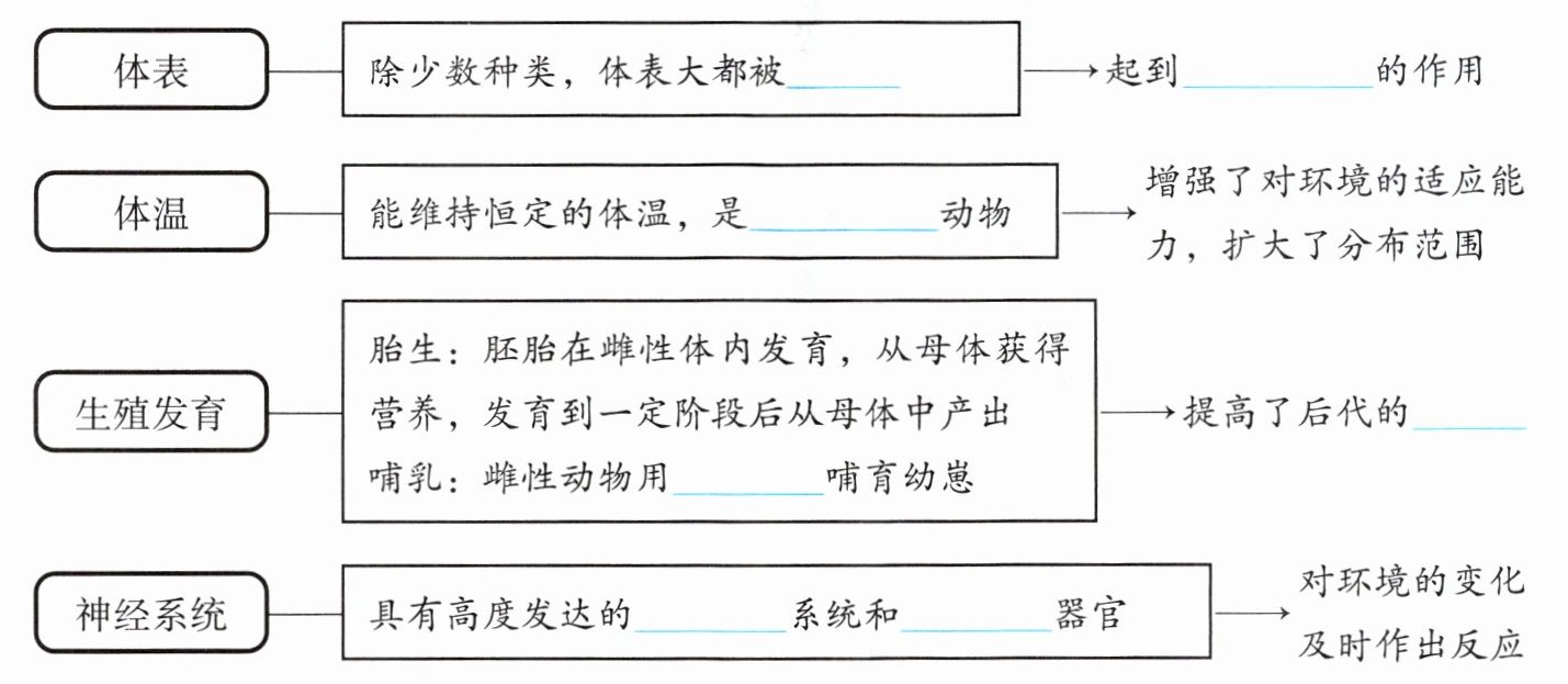 借助课本图片、标本、视频等素材,观察多种哺乳动物,并结合生活经验填写下表。
