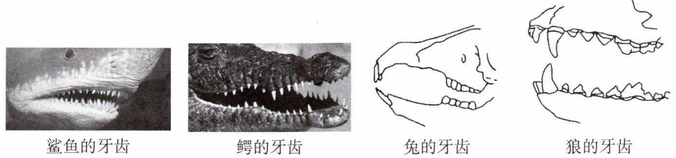 (1)与鲨鱼、鳄的牙齿相比,兔和狼的牙齿都出现了分化,这提高了哺乳动物摄取食物的能力,也增强了对食物的