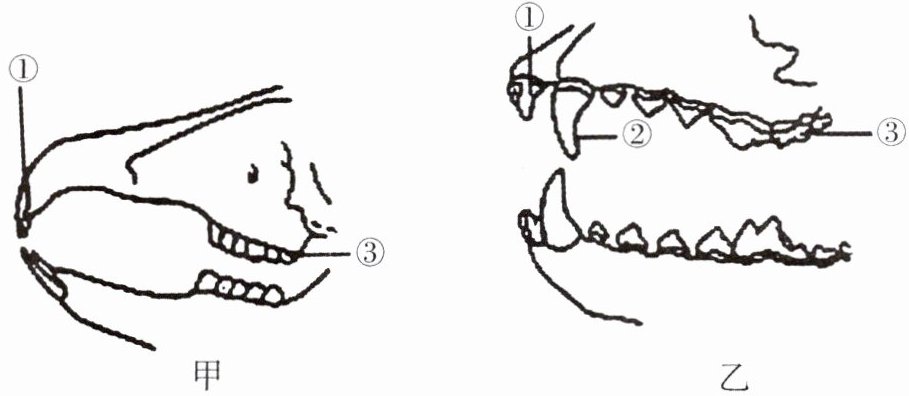 9.(1)①门齿 ②犬齿 ③臼齿 (2)甲 乙 兔的牙齿只有门齿和臼齿,没有犬齿,这是与它们的植食性生活相适应的。狼是肉食性动物,除了门齿和臼齿外,还有发达的犬齿