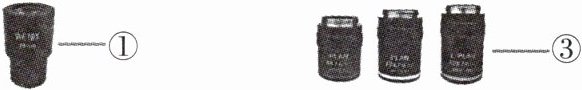 1.结构①是目镜,安放在镜筒上方,接近观察者的眼睛,放大倍数通常有5×、10×。结构③是物镜,有螺纹结构,安装在转换器上,放大倍数通常有10×、40×。