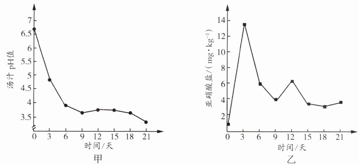 资料三:新鲜蔬菜中的硝酸盐易转化成亚硝酸盐,长期食用亚硝酸盐超标的蔬菜会影响人体健康。以下是泡菜发酵过程中汤汁酸碱度(酸碱度用pH值表示,pH值越低,酸性越大)及亚硝酸盐含量的变化。