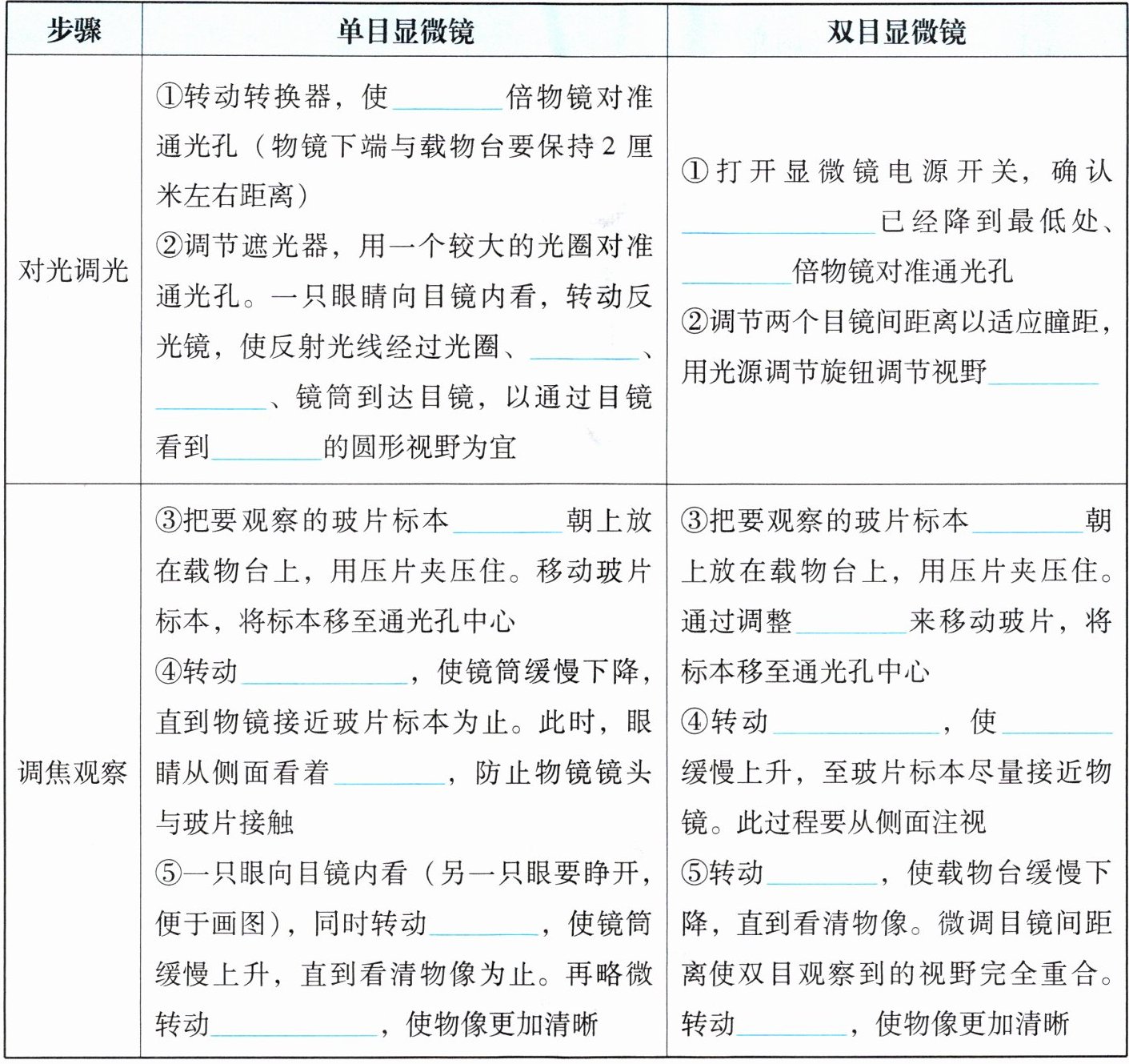 ⑤转动粗准焦螺旋,使载物台缓慢下降,直到看清物像。微调目镜间距离使双目观察到的视野完全重合。转动细准焦螺旋,使物像更加清晰