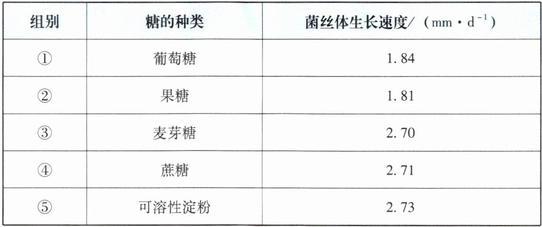 7. 紫丁香蘑是一种食用菌,素有“一家食其味,十家闻其香”的美誉。为提高紫丁香蘑的产量,研究人员配制了含不同营养物质的培养基,对紫丁香蘑的生长开展系列研究(各组均在温度为$25^{\circ}C$时培养),部分实验数据如下表。请据此回答问题。
