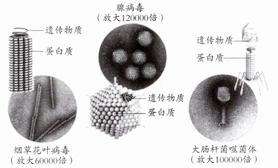 观察电子显微镜下的几种病毒及其结构模式图,比较它们的相同点和不同点。