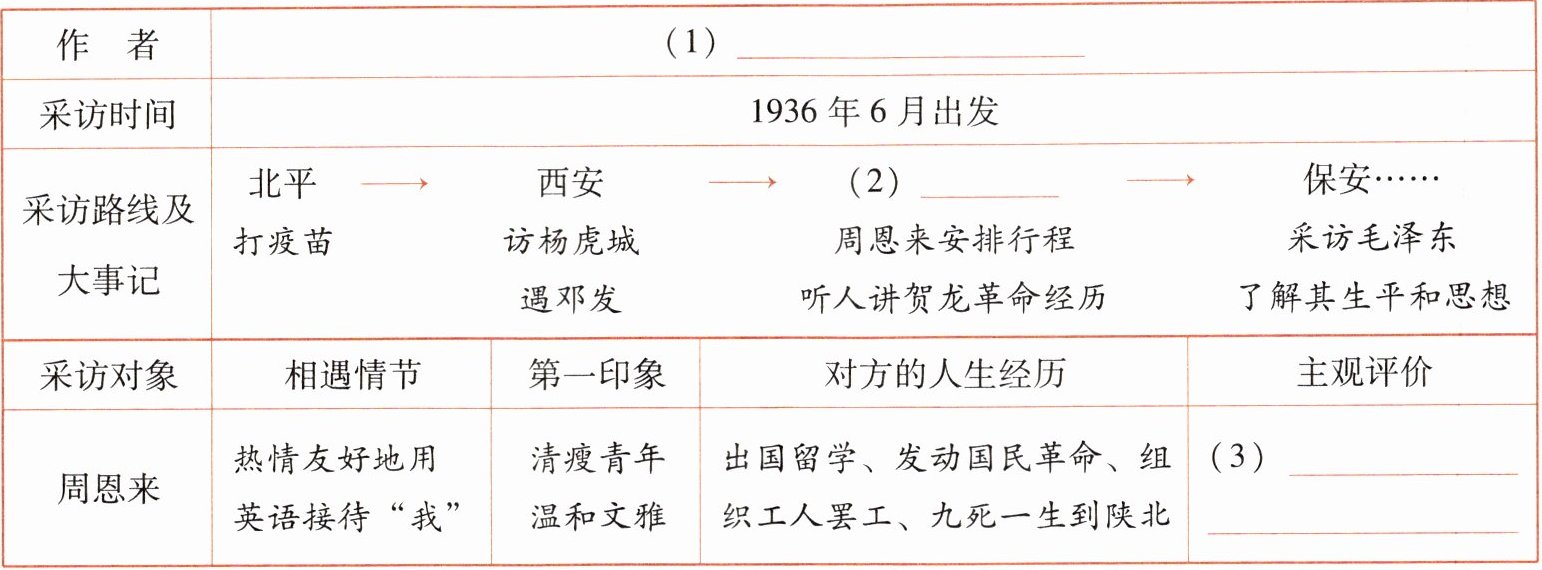 |采访路线及大事记|北平→西安→(2)______→保安……打疫苗 访杨虎城 周恩来安排行程 采访毛泽东遇邓发 听人讲贺龙革命经历 了解其生平和思想|