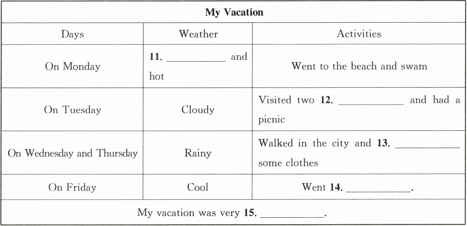 11. Sunny 12. parks 13. bought 14. shopping 15. wonderful