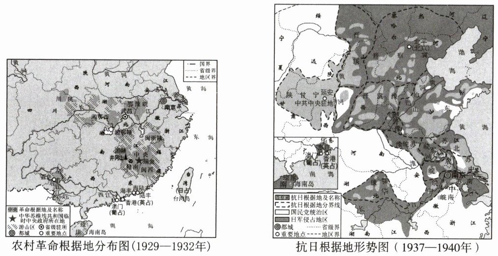 14. 时空观念是历史学科的核心素养之一。下面两幅图片反映了新民主主义革命时期中国共产党领导的根据地的变化。下列关于根据地变化的表述正确的是( )