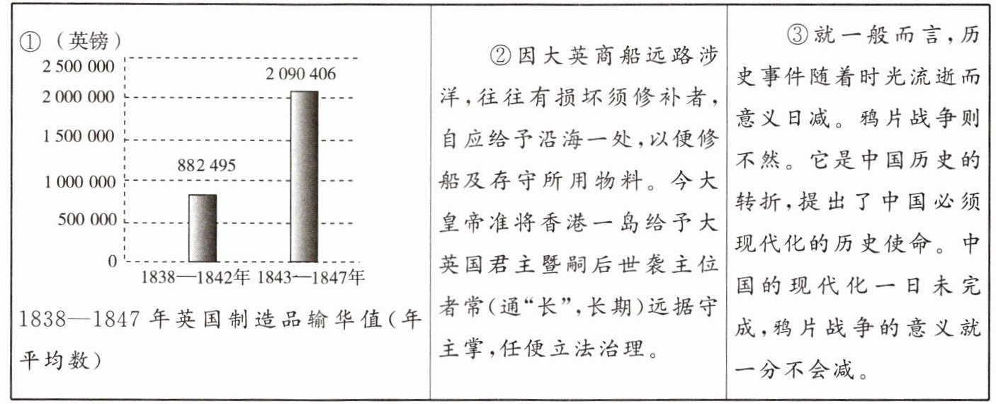 1838—1847年英国制造品输华值(年平均数)|②因大英商船远路涉洋,往往有损坏须修补者,自应给予沿海一处,以便修船及存守所用物料。今大皇帝准将香港一岛给予大英国君主暨嗣后世袭主位者常(通“长”,长期)远据守主掌,任便立法治理。|③就一般而言,历史事件随着时光流逝而意义日减。鸦片战争则不然。它是中国历史的转折,提出了中国必须现代化的历史使命。中国的现代化一日未完成,鸦片战争的意义就一分不会减。|