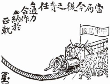 9. 右面是 1916 年 6 月 12 日发表在《新闻报》上题为《当局今后之责任》的漫画。画中火车头上插着一面写有“中华民国”的大旗和两面五色旗,但是火车已经脱轨,众人正在合力将列车推入轨道。此漫画反映了( )
