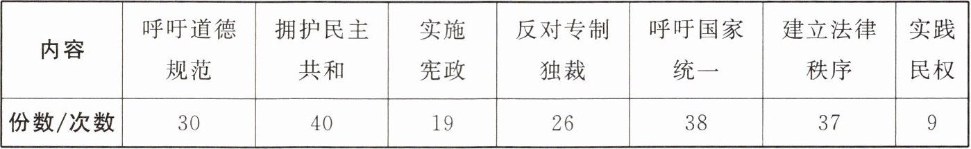 |内容|呼吁道德规范|拥护民主共和|实施宪政|反对专制独裁|呼吁国家统一|建立法律秩序|实践民权|