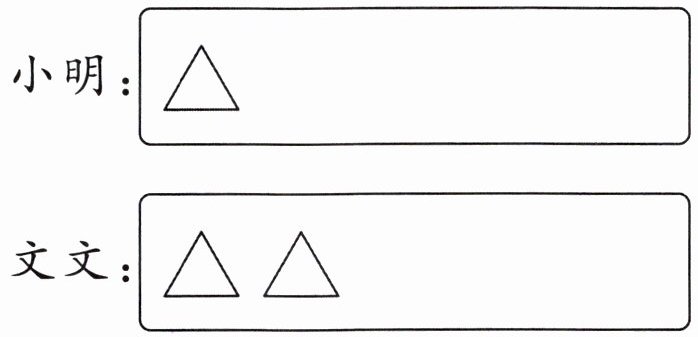 优优老师给每个小朋友 5 张三角形的彩纸做手工,做完后小明剩下 1 张彩纸,文文剩下 2 张彩纸,请你用“$\triangle$”把两人用了的彩纸补画出来。