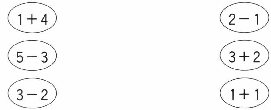 $\begin{array}{c}\boxed{1 + 4}\\\boxed{5 - 3}\\\boxed{3 - 2}\end{array}$ $\begin{array}{c}\boxed{2 - 1}\\\boxed{3 + 2}\\\boxed{1 + 1}\end{array}$