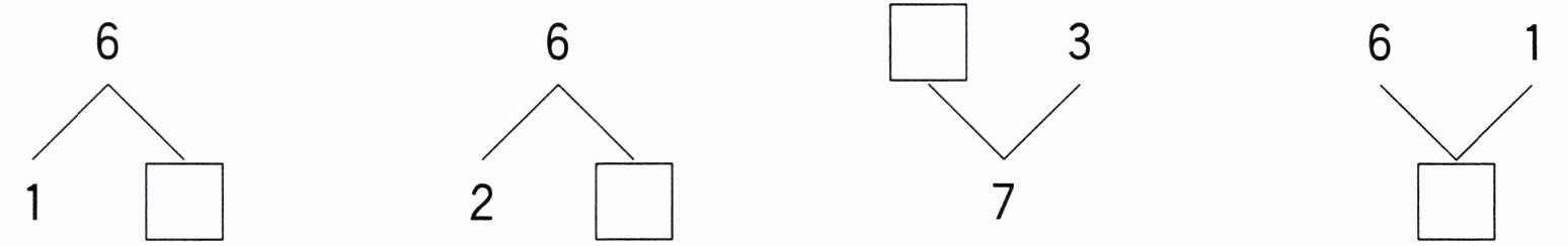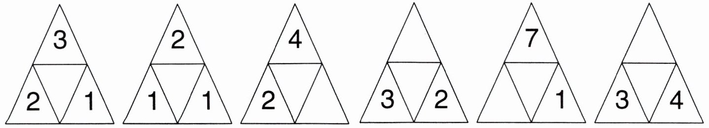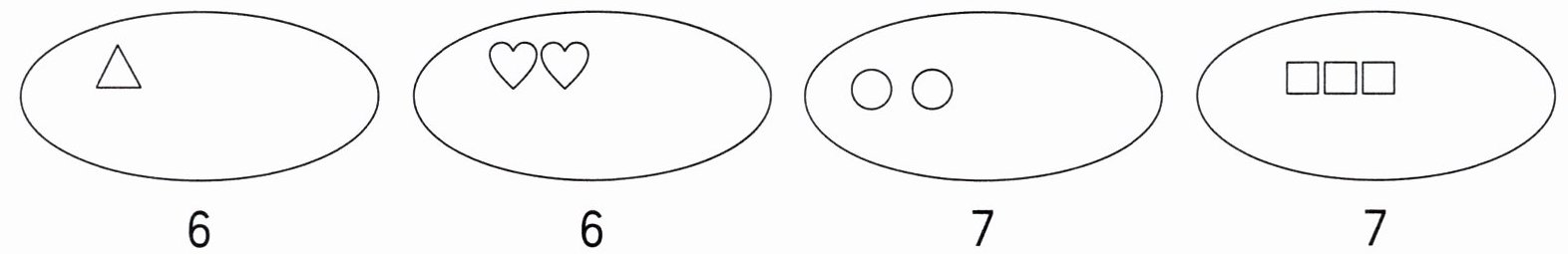 根据每个椭圆形下面的数字,确定需要画出的图形数量,第一个椭圆形下方是6,里面已有1个三角形,需再画5个三角形;第二个椭圆形下方是6,里面已有2个心形,需再画4个心形;第三个椭圆形下方是7,里面已有2个圆形,需再画5个圆形;第四个椭圆形下方是7,里面已有3个正方形,需再画4个正方形。