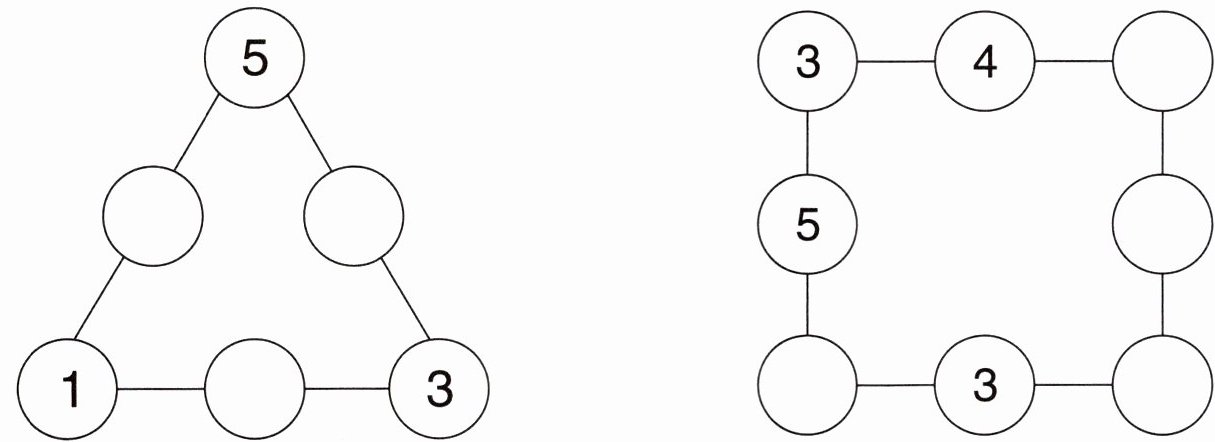 5. 在$◯$里填上合适的数,使每条线上的 3 个数相加都等于 9。