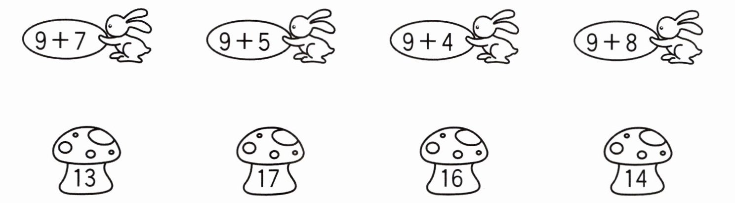 第一只小兔(9+7)连接到16的蘑菇,第二只小兔(9+5)连接到14的蘑菇,第三只小兔(9+4)连接到13的蘑菇,第四只小兔(9+8)连接到17的蘑菇。