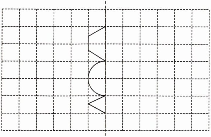 (在提供的方格纸上,以虚线为对称轴,对称画出左侧图形的右侧对称部分,形成一个完整的对称图形,即上下两个三角形对称,中间半圆对称形成一个完整的圆)。
