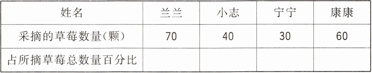 7. 草莓基地的草莓成熟了,优优老师带着兰兰、小志、宁宁和康康去采摘草莓。他们采摘的数量如下表所示,请你算出他们各自采摘的草莓数量占所摘草莓总数量的百分比,填在下表中。