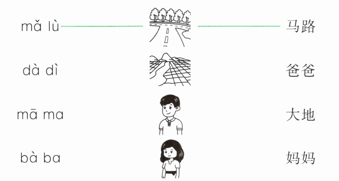 $\begin{array}{ccc}\mathrm{m}ǎ\mathrm{l}ù& ---& ---马路\\ \mathrm{d}à\mathrm{d}ì& ---& ---大地\\ \mathrm{m}ā\mathrm{m}a& ---& ---妈妈\\ \mathrm{b}à\mathrm{b}a& ---& ---爸爸\end{array} $