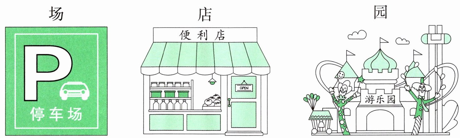 1. 在第一张代表停车场的图片上方圈出“场”字;