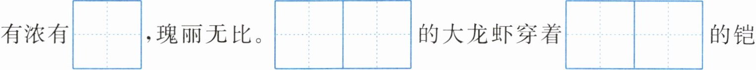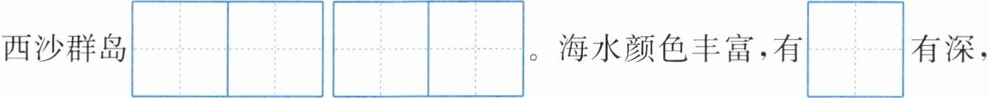 西沙群岛 fēng jǐng yōu měi。海水颜色丰富,有 qiǎn 有深,有浓有 dàn,瑰丽无比。hǎi dǐ 的大龙虾穿着 hòu hòu 的铠甲,有的鱼儿全身 bù mǎn 彩色的条纹,有的鱼儿周身像插着好些扇子……