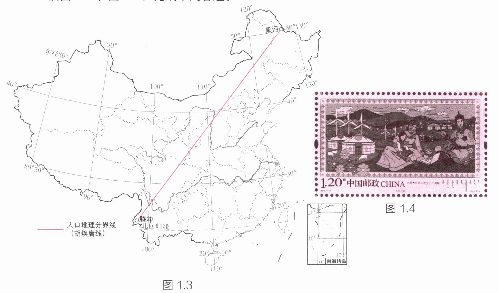 (4) 图 1.4 邮票所示的少数民族是什么?将图 1.4 与图 1.3 中该民族聚居的省级行政区用直线相连。