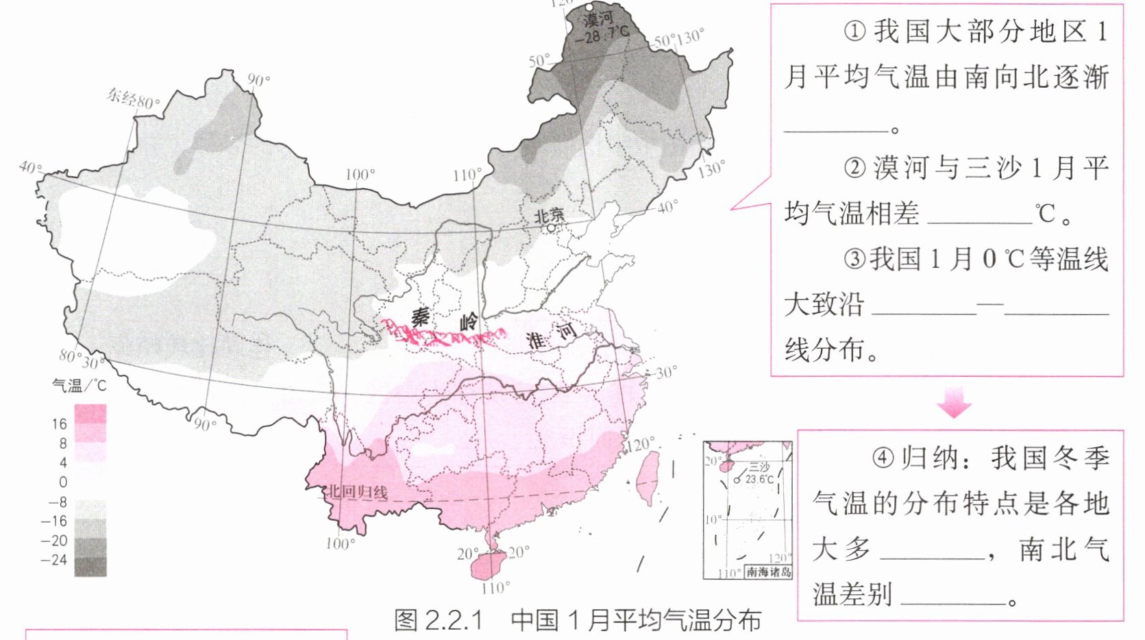 (1) 在图 2.2.1 中描绘我国 1 月 $0^{\circ}C$ 等温线,观察气温分布情况,圈出我国冬季最寒冷的地方——漠河,归纳我国冬季气温分布特点。