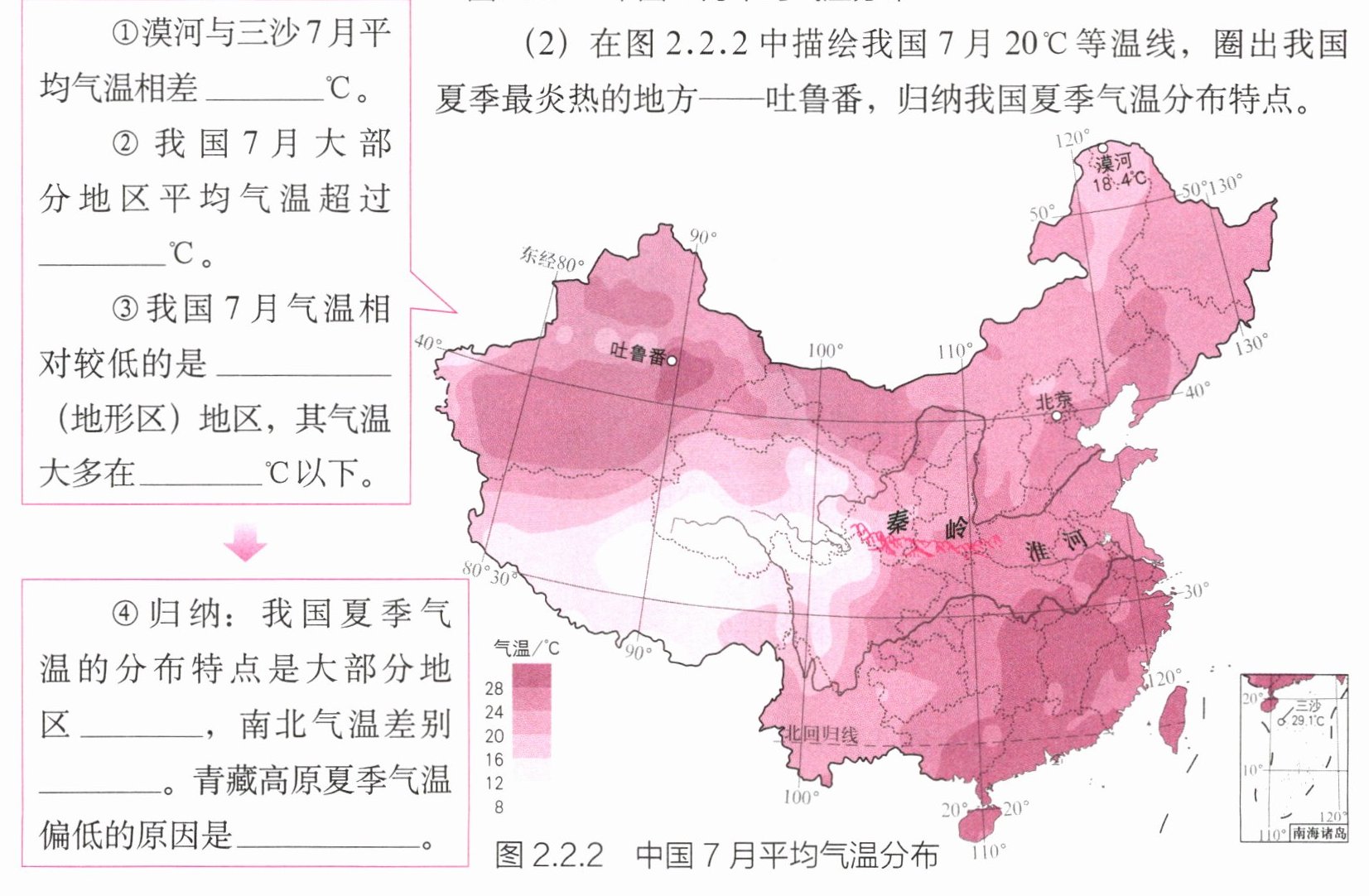 。(2) 在图 2.2.2 中描绘我国 7 月 $20^{\circ}C$ 等温线,圈出我国夏季最炎热的地方——吐鲁番,归纳我国夏季气温分布特点。