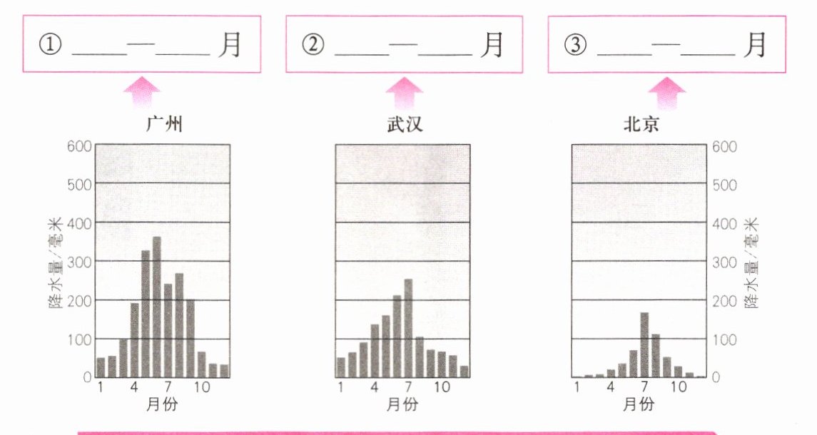 (1) 读图 2.2.4,填写我国东部广州、武汉、北京三个城市降水量达到或超过 100 毫米的月份,归纳北方和南方雨季的时间特点。