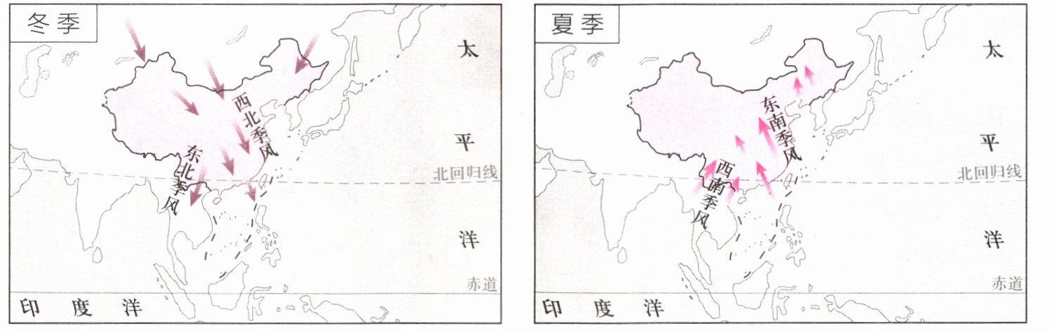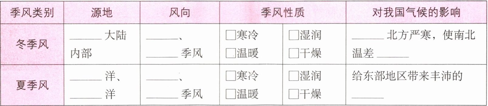 季风|$□$寒冷 $□$温暖 $□$湿润 $□$干燥|给东部地区带来丰沛的降水