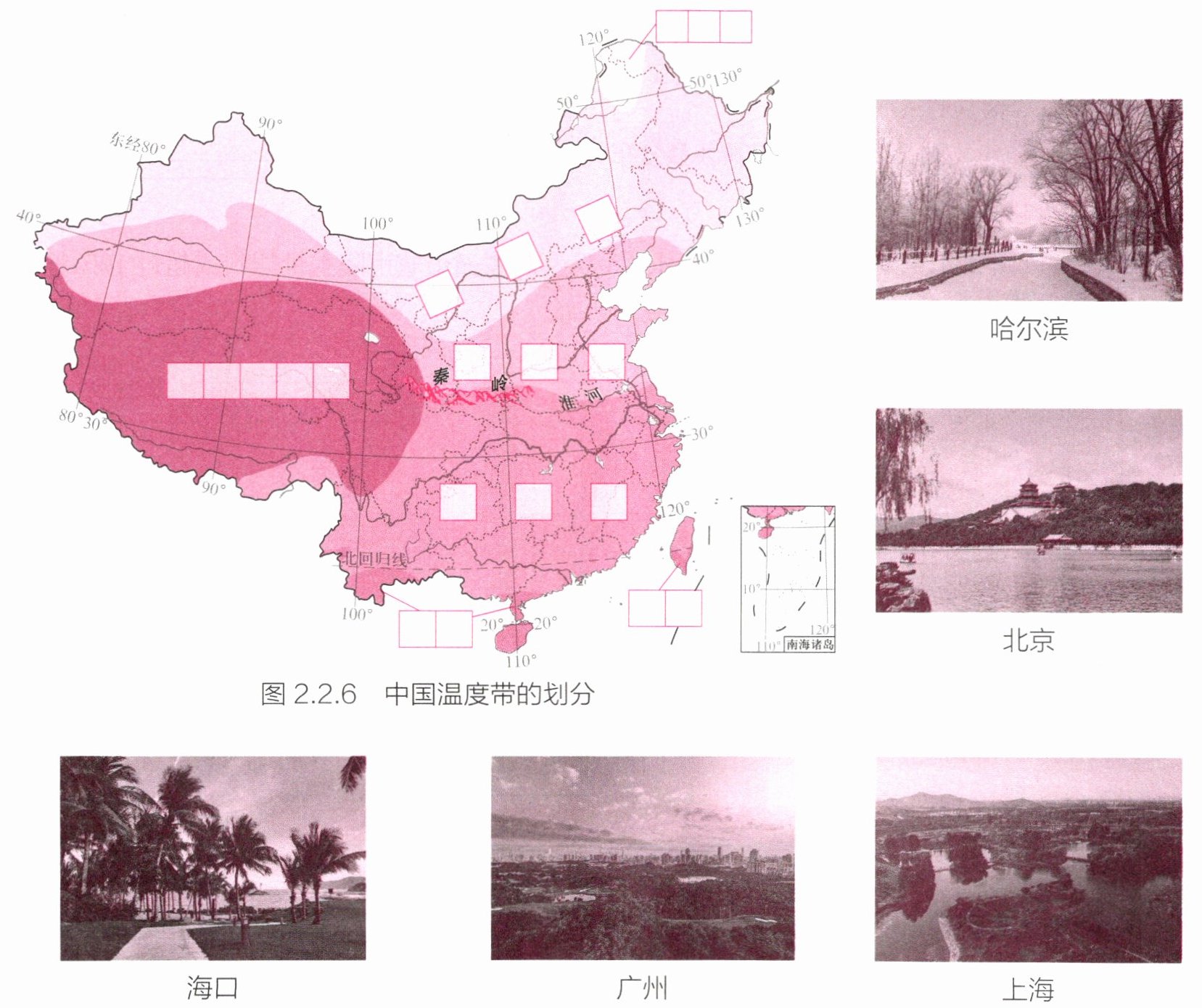 (1) 在图 2.2.6 的字框内填写我国各温度带的名称,并将下列城市与其所在温度带连线。
