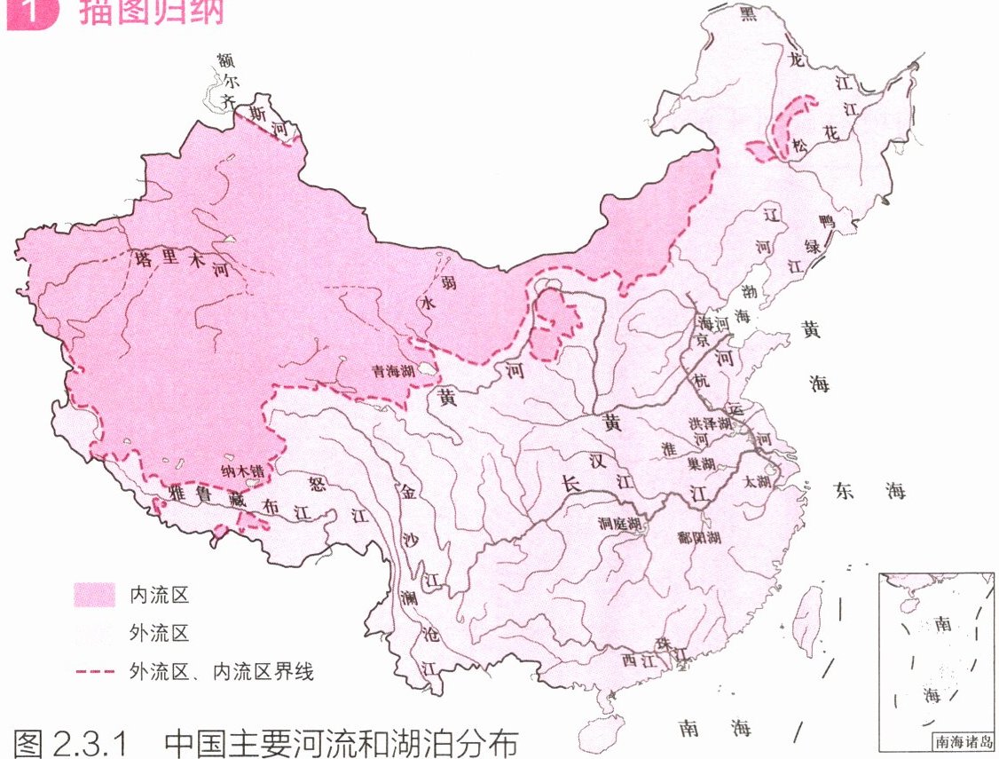 (2) 在图 2.3.1 中用蓝色笔描绘长江、黄河、珠江、黑龙江、雅鲁藏布江、额尔齐斯河、塔里木河;圈出青海湖。