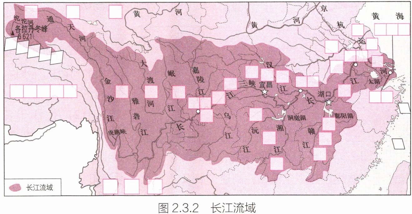 (1) 在图 2.3.2 中用蓝色笔描绘长江干流和主要支流:嘉陵江、岷江、汉江、湘江、赣江。圈出长江流域的三个淡水湖:鄱阳湖、洞庭湖、太湖。在相应字框内填写长江发源地山脉和注入海域的名称。圈出“☆”代表的长江上、中、下游分界处:宜昌和湖口。