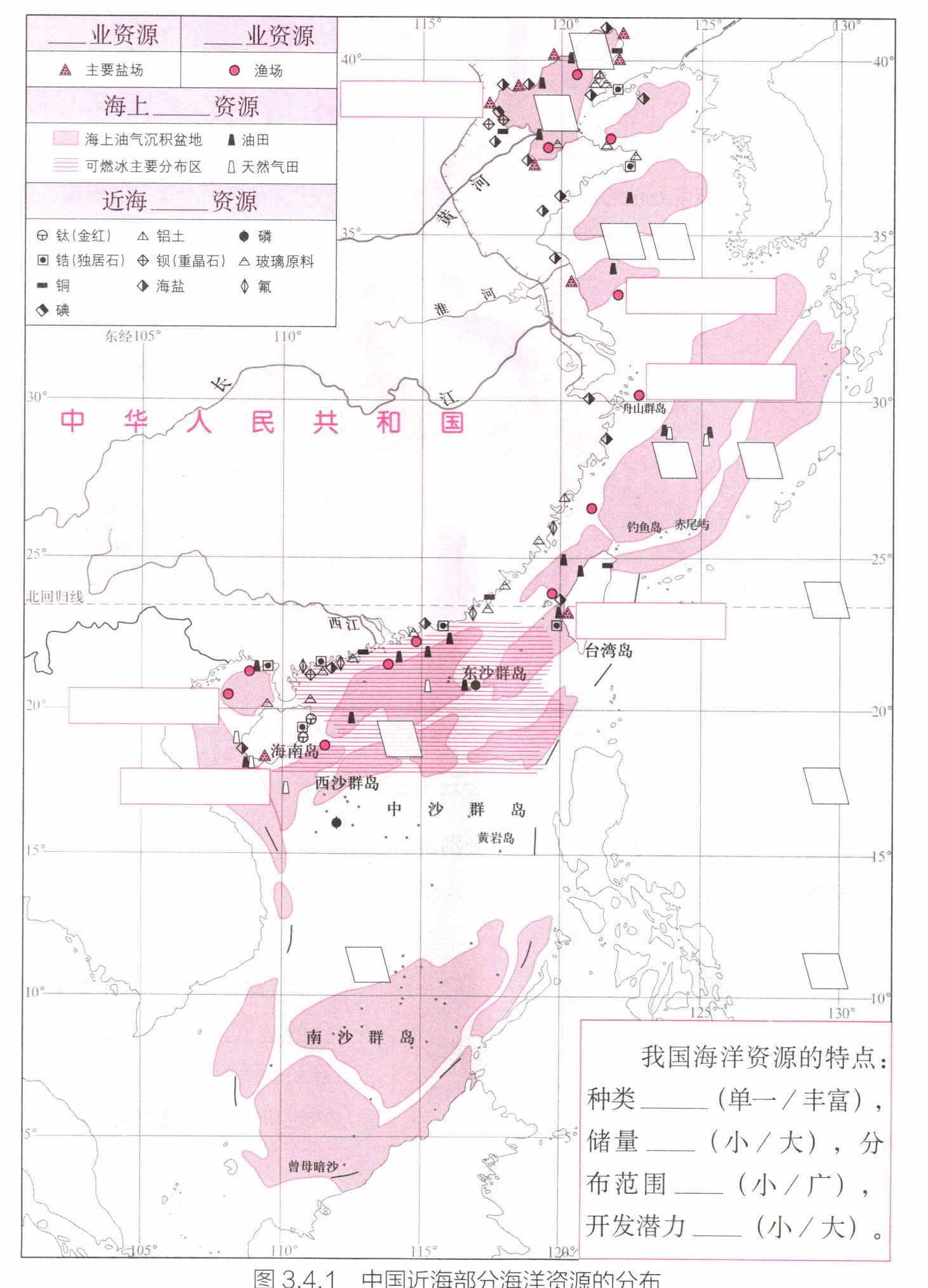 (3)在图3.4.1的图例处将我国海洋资源的类型补充完整,并归纳我国海洋资源的特点。