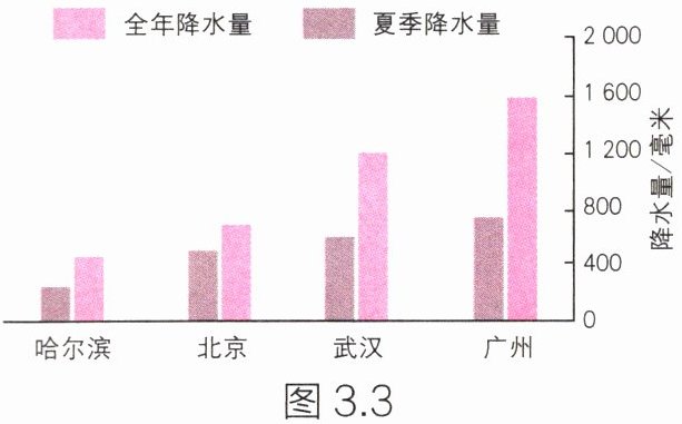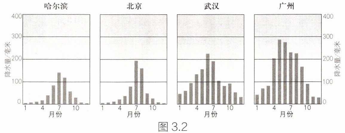 7. 读图2.2.3(中国年降水量分布)、图3.2.1(中国水资源丰缺带及主要河流径流量分布)、图2.3.1(中国主要河流和湖泊分布)以及图3.2和图3.3,选择合适的资料分析我国水资源时空分布特点。
