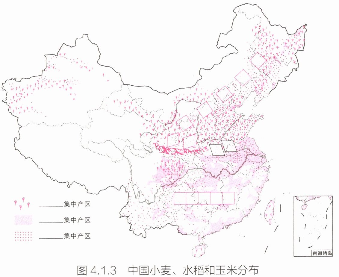 (3) 图例从上到下依次为:玉米集中产区、小麦集中产区、水稻集中产区。