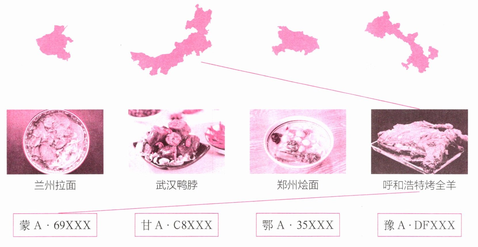 5. 河南省——郑州烩面——豫A·DFXXX 内蒙古自治区——呼和浩特烤全羊——蒙A·69XXX 湖北省——武汉鸭脖——鄂A·35XXX 甘肃省——兰州拉面——甘A·C8XXX