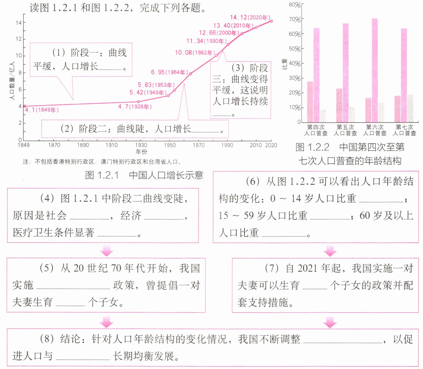 1.(1)较慢 (2)迅速 (3)放缓 (4)稳定 快速发展 改善 (5)计划生育 一 (6)先下降后上升 先上升后下降 逐渐上升 (7)三 (8)生育政策 社会经济